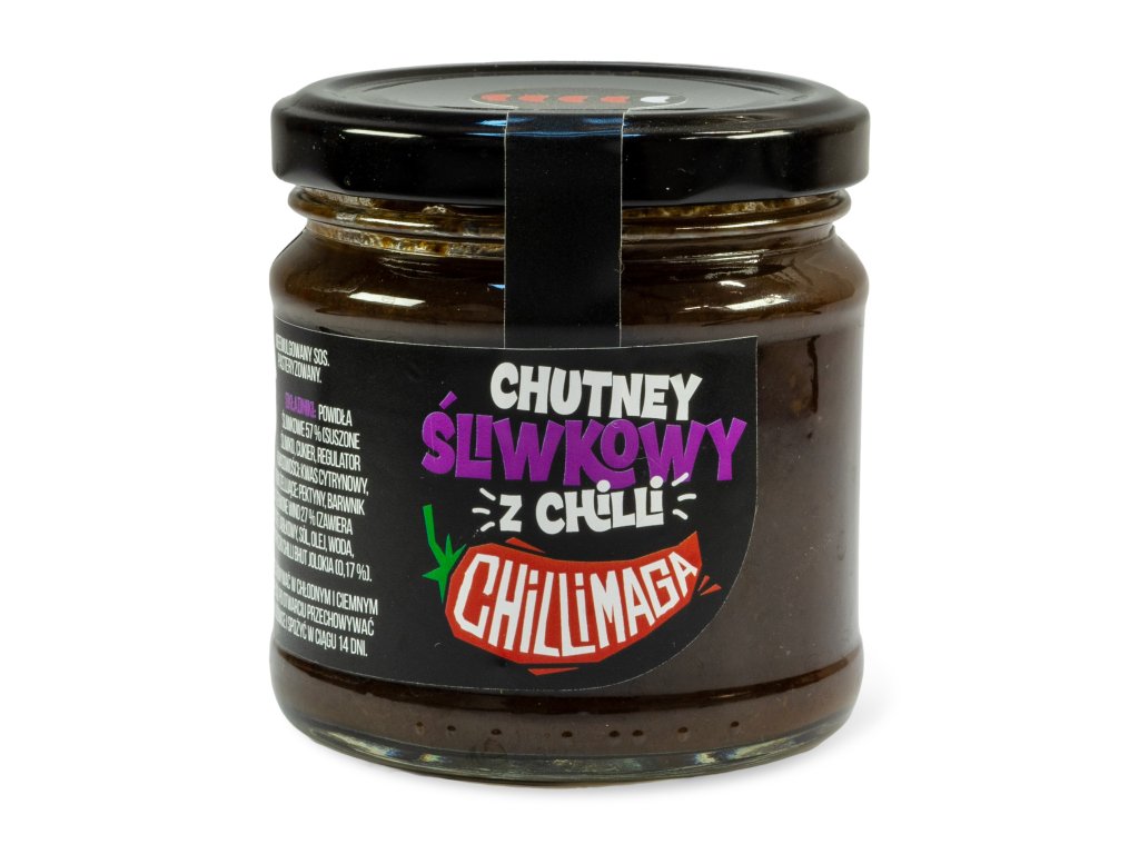 Składniki: Powidła śliwkowe 57 % (suszone śliwki), cukier, regulator kwasowości: kwas cytrynowy, środki żelujące: pektyny, barwnik karmelowy), cebula, czerwone wino 27 % (zawiera siarczyny), czosnek, ocet jabłkowy, sól, olej, woda, mieszanka przypraw, papryczki chilli Bhut Jolokia.