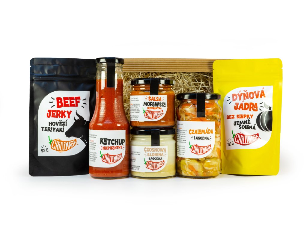 Salsa Morawska Niepikantna, Czosnowa słonina łagodna, Pestki dyni z solą (łuskane), Czalamáda łagodna, Ketchup Niepikantny i Suszone Beef Jerky Teriyaki.