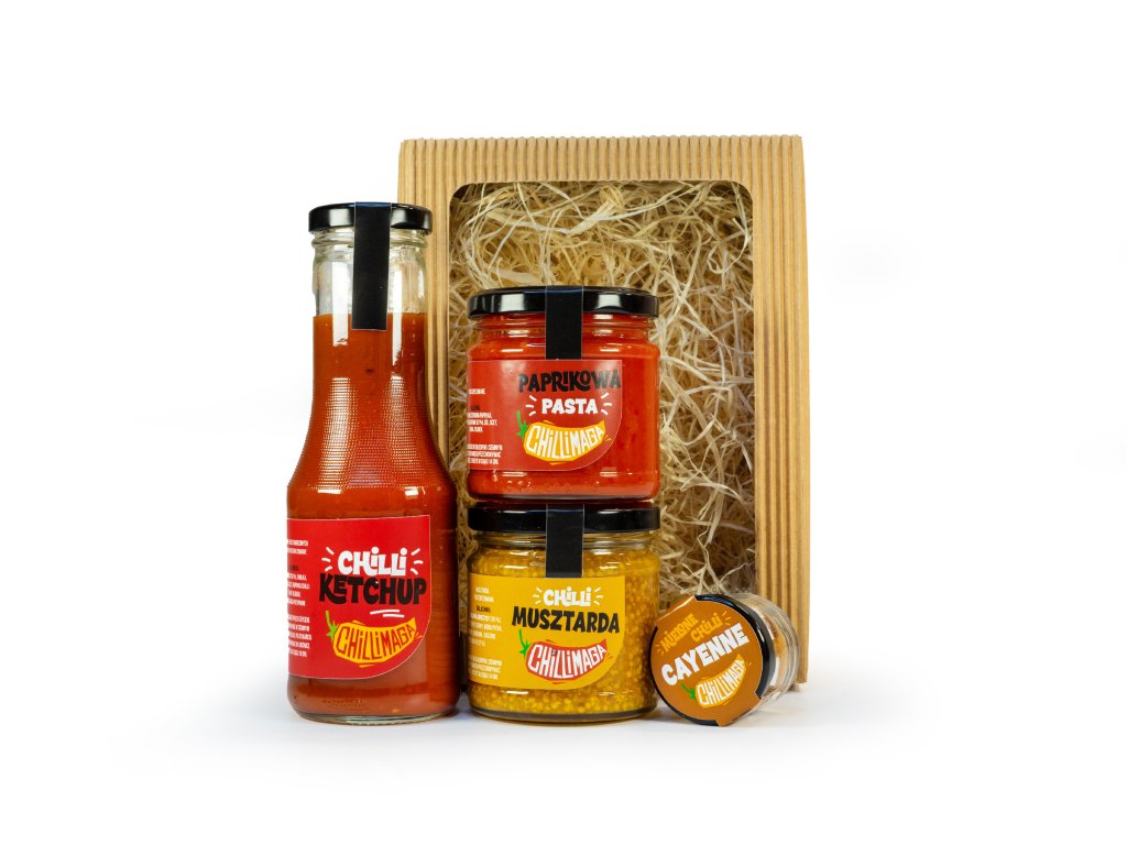 Mały zestaw dodatków, w którego skład wchodzą klasyczne produkty, czyli keczup, musztarda, pasta paprykowa i mielony pieprz Cayenne. Wszystko to zapakowane w niewielkie, ładne i proste pudełko prezentowe. Doskonale zdajemy sobie sprawę z tego, że wielu naszych klientów ceni sobie klasyczne sosy i dodatki, które dobrze znają. Bo nie zawsze mamy ochotę na odkrywanie nowości - doskonale to rozumiemy, dlatego stworzyliśmy ten zestaw. Możesz mieć pewność, że te pyszności sprawią Ci ogromną przyjemność, gdy dodasz je do swoich potraw. Śmiało, kiełbaska z grilla aż się prosi o zawartość tego niepozornego pudełka.