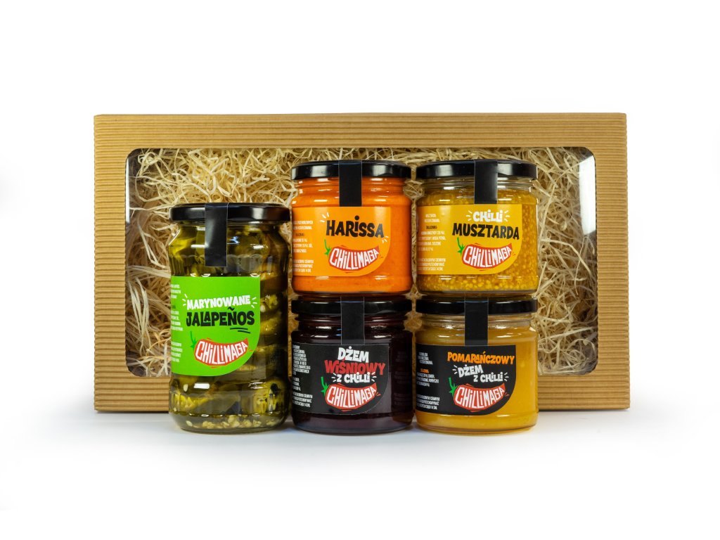Coś specjalnie dla nieśmiałych fanów chilli. Piękne i proste pudełko prezentowe, a w nim nasze produkty z chilli o nieco mniejszej mocy. Nie ma się czego bać – trzeba spróbować!