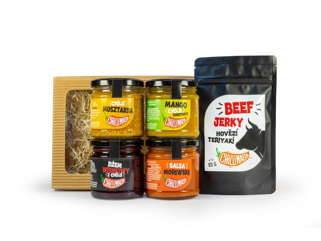 Dżem wiśniowy z chilli, Mango chilli chutney, Chilli Musztarda, Salsa Morawska oraz Suszone Beef Jerky Teriyaki.